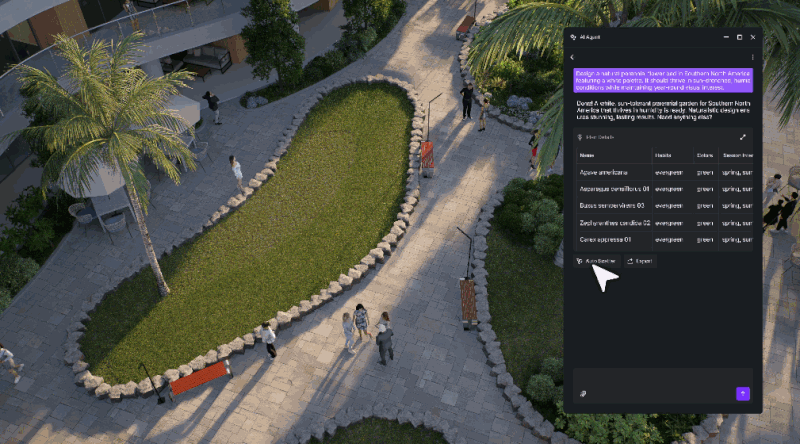 SmartPlanting génère automatiquement des combinaisons de végétation spécifiques au site et adaptées au climat à partir de l’emplacement de votre projet. Tout est en temps réel, comme si vous « jardiniez » numériquement.